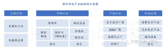 探針作為半導(dǎo)體產(chǎn)品測試的關(guān)鍵部件,處于半導(dǎo)體產(chǎn)業(yè)鏈中游的測試設(shè)備及其零部件制造行業(yè),探針行業(yè)的上游為金屬加工,電鍍行業(yè),下游為芯片設(shè)計、晶圓制造及晶圓代工、封裝與測試行業(yè),經(jīng)測試達到設(shè)計規(guī)范要求的半導(dǎo)體產(chǎn)品最終應(yīng)用與消費電子、汽車電子、通訊設(shè)備等眾多領(lǐng)域。